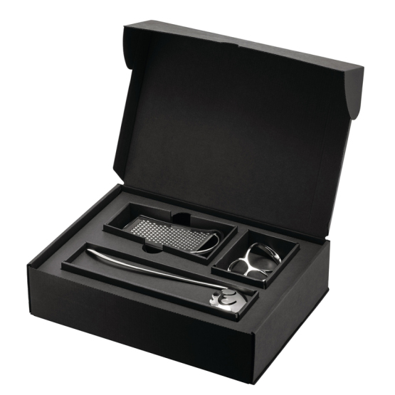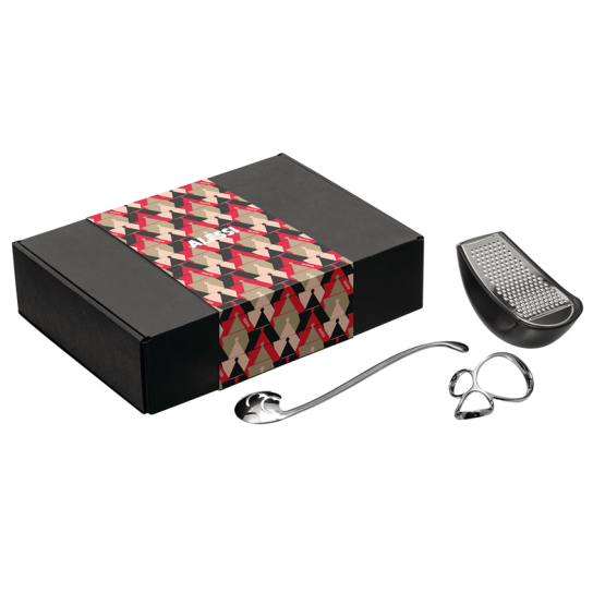 Pakkaus sisältää ”Vabene” pastantestaajan, ”Voile” spagettimitan (1, 2 ja 4 annosta varten) sekä mustan ”Parmenide” parmesaaniraastimen.