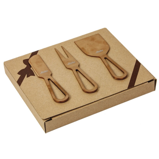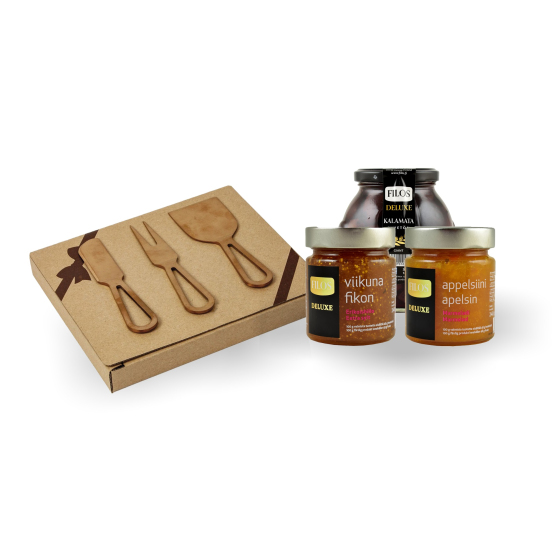Lahjasetti sisältää rosterisen ruusukultaisen juustovälinesetin, suurikokoisia kreikkalaisia kivellisiä kalamata-oliiveja kauniissa lasipurkissa, Filos Deluxe