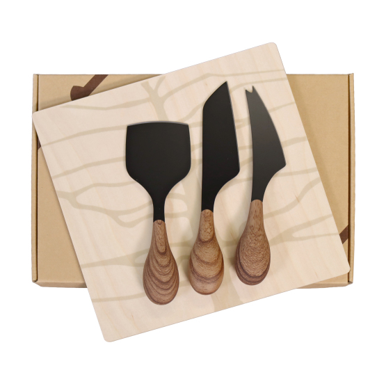 Juustojen herkuttelussa esillepano on puoli ruokaa. Tässä tyylikkäässä setissä on kotimainen tarjoilulauta Kelopuu-kuosilla sekä metalliset juustovälineet softgrip-kahvoilla. Laudan materiaali koivuvaneri, koko 26 x 25 x 0,8 cm. Juustokirves sopii hyvin pehmeille juustoille, juustoveitsi puolikoville ja juustotaltta koville juustoille. Välineet kestävät konepesun.