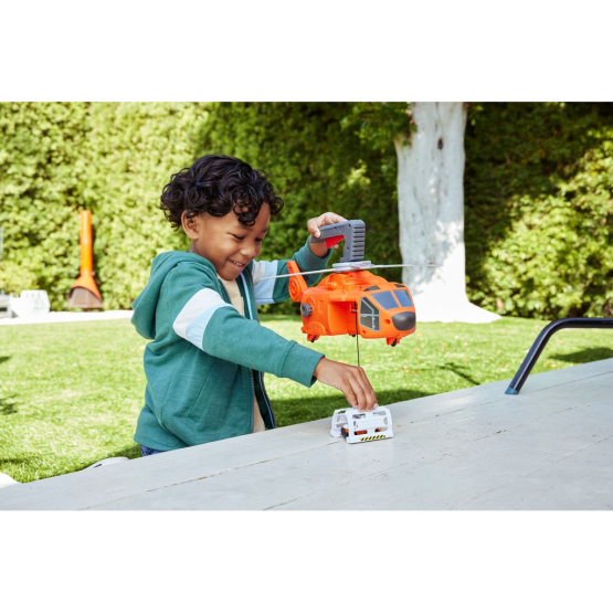 Pelastushelikopteri pelastaa ja kuljettaa hädässä olevia hoitoon. Lennätä helikopteria kahvasta, jonka nappia painamalla saat roottorit pyörimään. Kopterissa on vinssi, komentokeskus ja leikistä aktivoituvia toimintoja. Mukana 1 auto. Koko 39 cm. 3+