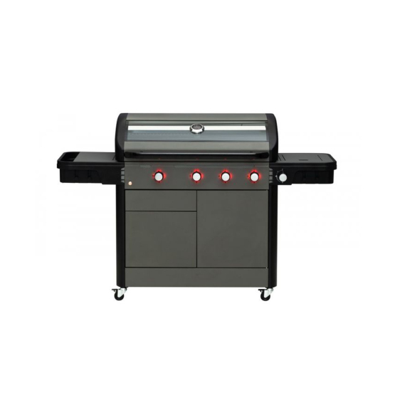 Näyttävä 4 poltin kaasugrilli tehokkaalla infrapuna sivukeittimellä. Pääpolttimien teho 3 x 3,5 kW + 1 x 4,0 kW. Infrapuna sivukeitin 4,0 kW. Kokonaisteho 18,5 kW. Pääpolttimet 201 ruostumattomasta teräksestä. 4,0 kW tehopoltin lihan pintojen sulkemiseen tai muuten suurta tehoa vaativiin grillauksiin. Polttimien uuden rakenteen ansiosta liekki palaa myös polttimien etuosassa. Näin pystytään hyödyntämään koko grillausalaa tehokkaaseen grillaamiseen. Sivukeitin soveltuu myös grillattavan lihan pintojen sulkemiseen. Grillausala 72 x 46 cm. Grillausritilät ovat mattaemaloitua valurautaa, joista 2 kpl 23,5 x 45 cm Multigrill- tuotteiden kanssa yhteensopivia ja 1 kpl 23,5 x 45 cm. Lämmitysritilä 67 x 14,5 cm emaloitua lankaterästä. Grillin tuplakansi ja runko pulverimaalattua terästä. Tulilaatikko emaloitua terästä. Tulilaatikon sivuseinissä lämpösuojapellit 430 ruostumattomasta teräksestä. Ne estävät lämmön johtumista grillin rakenteisiin, sekä pitävät lämmön tehokkaasti grillin sisällä. Polttimien sytytys integroitu säätönuppeihin. Lämmönjakopellit 3 kpl emaloitua terästä. Kaappi grillin alla on hyväksytty kaasupullolle. 2 isoa pyörää helpottavat grillin siirtoa.