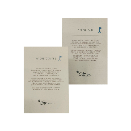 Suomessa käsityönä valmistettu tuleva klassikkotuote. Tämä suomalaisesta koivuviilusta huolella valmistettu valkolakattu tuote edustaa perinteistä suomalaista käsityöosaamista. Huolellinen viimeistely, ajaton muotoilu sekä kaunis paketti kruunaavat tämän lahjatuotteen.